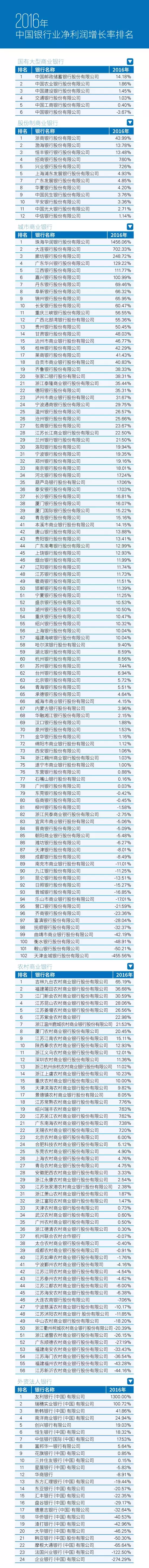 畢馬威于2017年7月27日發(fā)布了《2017年中國銀行業(yè)調查報告》,本文按國有大型商業(yè)銀行、股份制商業(yè)銀行、城市商業(yè)銀行、農(nóng)村商業(yè)銀行和外資法人銀行分類,對《2017年中國銀行業(yè)調查報告》中展示的200家銀行2016年的凈利潤增長率和凈息差兩大盈利能力指標進行了排名。